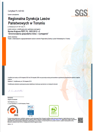 Nadleśnictwo Golub-Dobrzyń informuje, że certyfikat dla Regionalnej Dyrekcji Lasów Państwowych w Toruniu został oceniony i certyfikowany jako spełniający wymagania: Norma Krajowa PEFC PL 1003:2012 v. 2 "Zrównoważona gospodarka leśna - wymagania"
