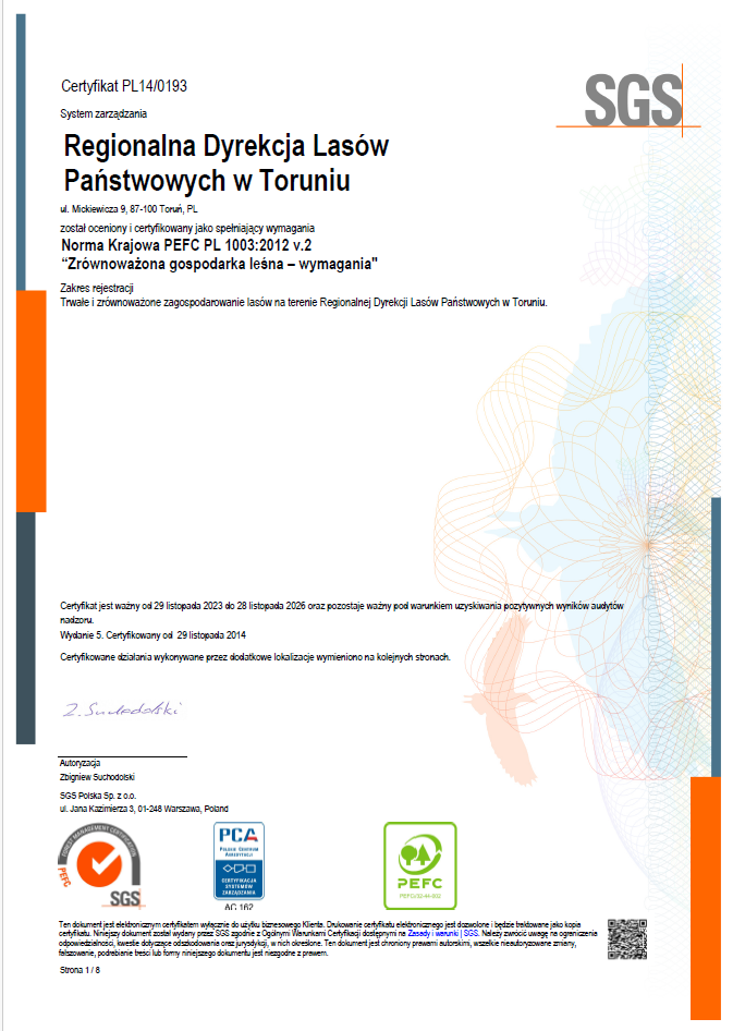 Nadleśnictwo Golub-Dobrzyń informuje, że certyfikat dla Regionalnej Dyrekcji Lasów Państwowych w Toruniu został oceniony i certyfikowany jako spełniający wymagania: Norma Krajowa PEFC PL 1003:2012 v. 2 "Zrównoważona gospodarka leśna - wymagania"